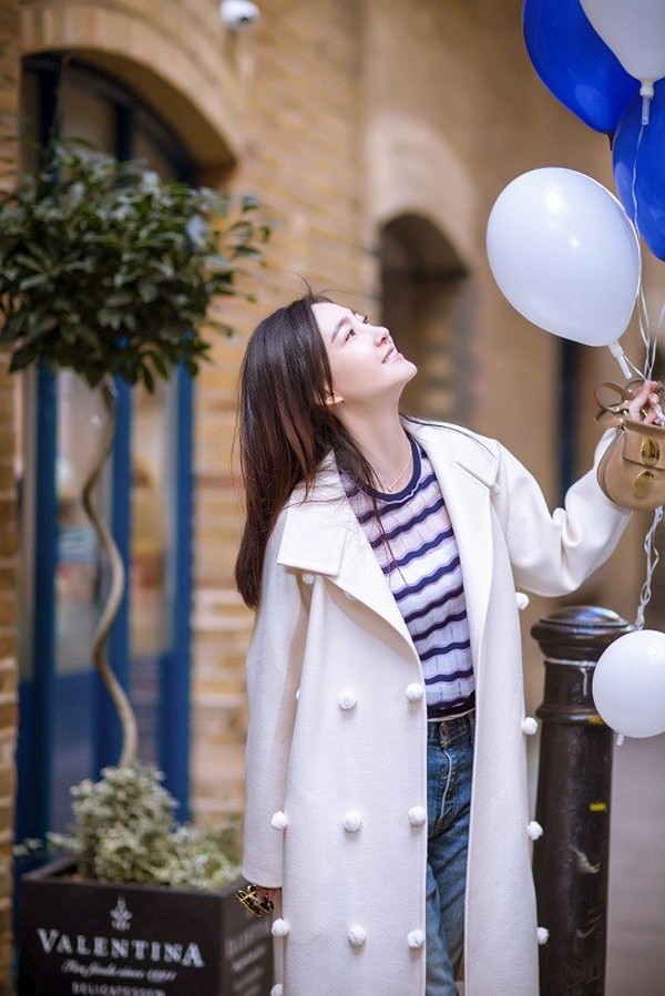 王丽坤手持蓝色气球漫步伦敦老街 回眸浅笑尽显恬静优雅东方女神邂逅英伦古巷 蓝色气球点亮静谧街角光影交错间展露精致侧颜 静谧沉思散发文艺气息倚靠古朴砖墙悠然自得 简约穿搭演绎街头时尚轻盈转身笑靥如花 蓝白气球伴随步伐摇曳生姿漫步石板路遥望远方 清新气质与古老城市对话